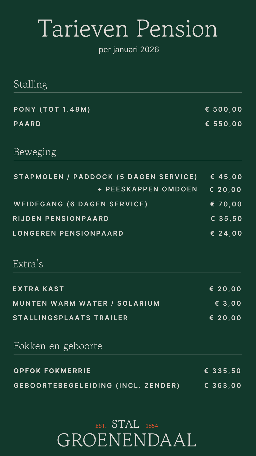 Ben je op zoek naar een plek waar je jouw paard met een gerust hart kunt achterlaten? Bij Stal Groenendaal bieden we hoogwaardig pension met de beste zorg. Onze ruime stallen, afgestemde voeding in slowfeeders en dagelijkse verzorging zorgen ervoor dat jouw paard zich helemaal thuis voelt.